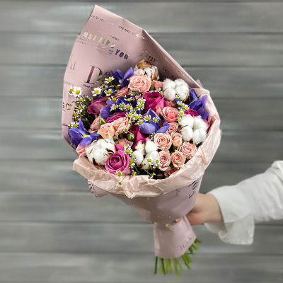 Букет из роз, ирисов и хлопка| 4 700 Р | без скидки |