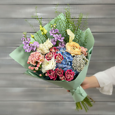 Гортензия,Маттиола,Ранункулюс,Роза кустовая Клустер,Калла микс 5,Гвоздика,Гиперикум,Седум,Хризантема одноголовая,Лизиантус,Тиласпия грин белл,Упаковка в ассортименте,Лента,Плёнка прозрачная