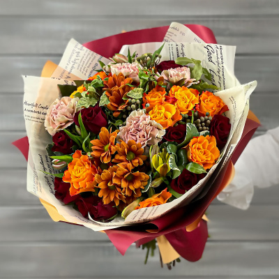 Роза 40 см,Гвоздика,Хризантема кустовая,Альстромерия,Капс Бруниа,Листья питтоспорума микс,Упаковка в ассортименте,Лента,Плёнка прозрачная