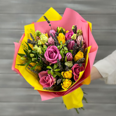Роза 40 см,Тюльпан,Лизиантус,Альстромерия,Листья питтоспорума микс,Лаванда сушёная,Упаковка в ассортименте,Лента,Плёнка прозрачная