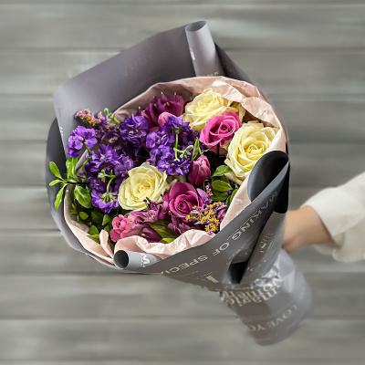 Роза РС 60 см,Маттиола кустовая ,Тюльпан,Роза 40 см,Солидаго микс краш,Альстромерия,Листья питтоспорума микс,Бумага упаковочная Тишью,Упаковка в ассортименте,Лента,Плёнка прозрачная