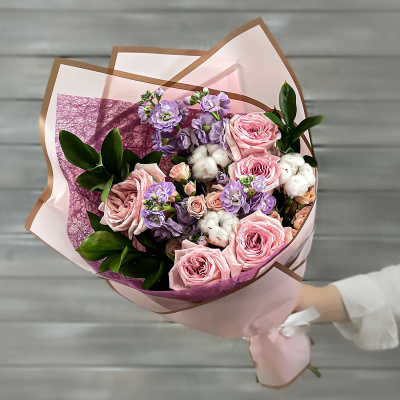 Букет из роз, маттиолы и хлопка| 4 700 Р | без скидки |