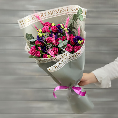 Кустовая роза 60 см РС,Лизиантус,Листья эвкалипт микс,Тритикум краш (пучок) пшеница,Упаковка в ассортименте,Лента,Плёнка прозрачная