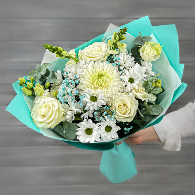 Хризантема кустовая,Хризантема одноголовая,Роза Мондиаль 60 см,Гипсофила краш.,Лизиантус,Леувенбек,Листья эвкалипт микс,Лента,Упаковка в ассортименте,Плёнка прозрачная