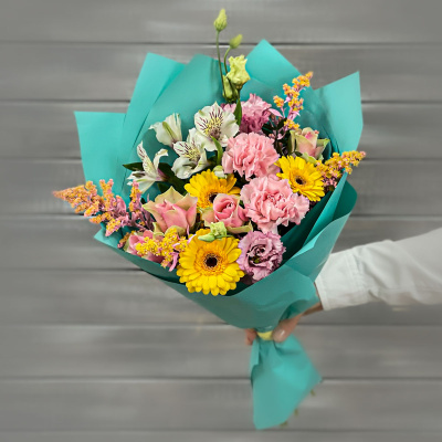 Гербера мини,Альстромерия,Лизиантус,Солидаго микс краш,Гвоздика,Роза Кения 40 Лабелла,Упаковка в ассортименте,Лента,Плёнка прозрачная