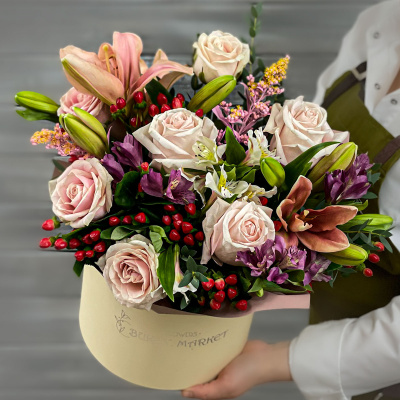 Альстромерии, розы и лилии в шляпной коробке| 10 700 Р | без скидки |