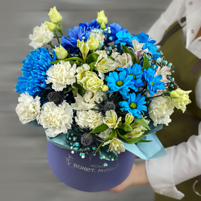 Гвоздики, хризантемы и альстромерии в шляпной коробке| 8 000 Р | без скидки |