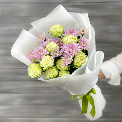 Роза кустовая Клустер,Хризантема кустовая,Упаковка в ассортименте,Лента,Плёнка прозрачная