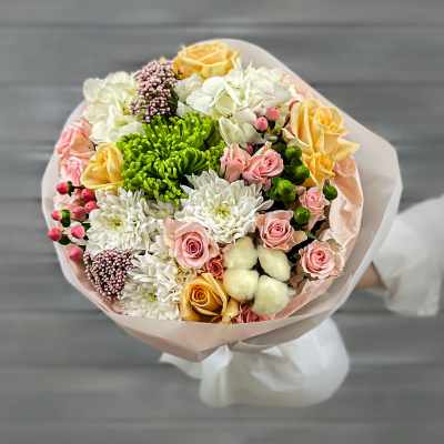 Хризантема одноголовая,Озотамнус,Гортензия,Хризантема кустовая,Роза кустовая 50 см,Роза РС 50 см,Хлопок,Гиперикум,Бумага упаковочная Тишью,Лента,Упаковка в ассортименте,Плёнка прозрачная