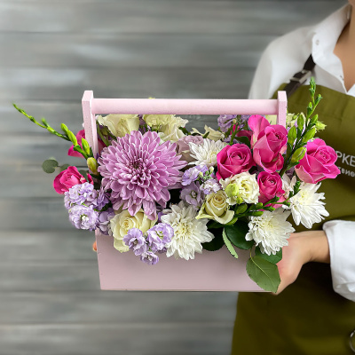 Композиция в деревянном ящике из хризантем, роз и маттиол| 6 700 Р | без скидки |