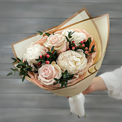 Пион высший сорт,Гиперикум,Роза Охара микс,Листья эвкалипт микс,Бумага упаковочная Тишью,Упаковка в ассортименте,Лента,Плёнка прозрачная