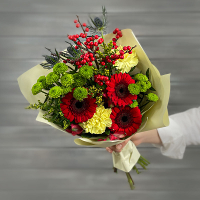 Гербера мини,Хризантема сантини,Эрингиум,Илекс микс,Гвоздика,Солидаго микс,Альстромерия,Листья фисташки,Упаковка в ассортименте,Лента,Плёнка прозрачная