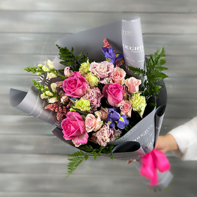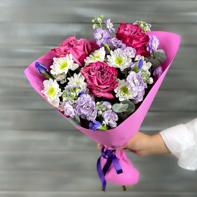 Роза Охара микс,Хризантема кустовая,Маттиола кустовая ,Листья эвкалипт микс,Ирис,Упаковка в ассортименте,Лента,Плёнка прозрачная
