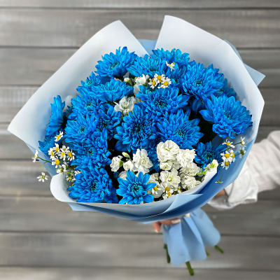 Букет из голубых хризантем, маттиолы и ромашек| 4 700 Р | без скидки |