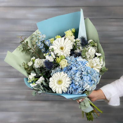 Гербера,Дельфиниум,Листья эвкалипт микс,Гортензия,Эрингиум,Лизиантус,Маттиола кустовая ,Упаковка в ассортименте,Лента,Плёнка прозрачная