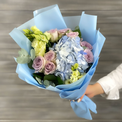 Гортензия,Роза Оушен сонг 40 см - 50 см,Лизиантус,Листья эвкалипт микс,Упаковка в ассортименте,Лента,Плёнка прозрачная