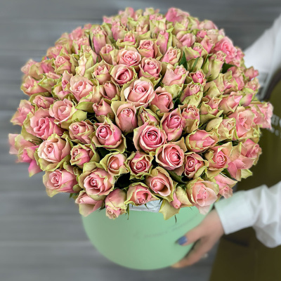Букет из 101 зелено-розовой Кенийской розы в шляпной коробке| 14 800 Р | без скидки |