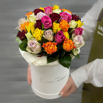 Букет из 35 разноцветных Кенийских роз в шляпной коробке| 6 700 Р | без скидки |