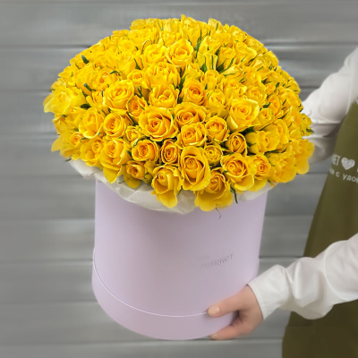 Букет из 101 желтой Кенийской розы в шляпной коробке| 14 000 Р | без скидки |