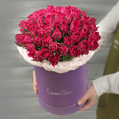 Букет из 51 малиновой Кенийской розы в шляпной коробке| 8 100 Р | без скидки |