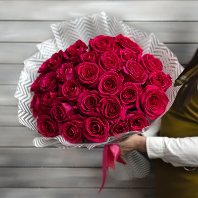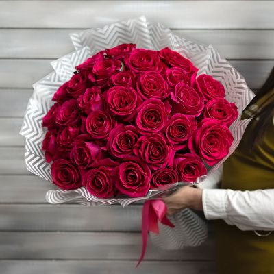 29 малиновых роз Эквадор 60 см в упаковке| 10 800 Р | без скидки |