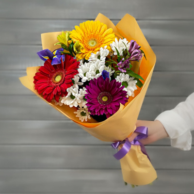 Гербера,Хризантема кустовая,Ирис,Альстромерия,Листья фисташки,Упаковка в ассортименте,Лента,Плёнка прозрачная