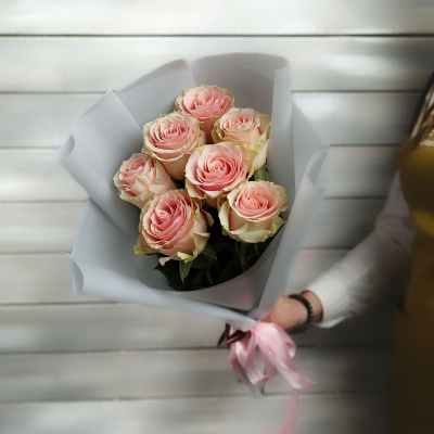 7 нежно-розовых роз в упаковке Эквадор 60 см| 3 700 Р | без скидки |