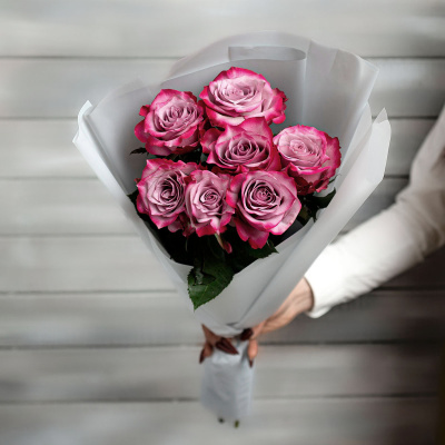 7 фиолетовых роз в упаковке Эквадор 60 см| 3 300 Р | без скидки |