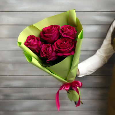 5 малиновых роз в упаковке Эквадор 60 см| 2 700 Р | без скидки |