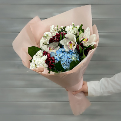 Орхидея Цимбидиум,Гортензия,Альстромерия,Маттиола кустовая ,Листья салал,Листья фисташки,Упаковка в ассортименте,Лента,Плёнка прозрачная