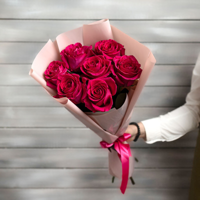 7 малиновых роз в упаковке Эквадор 60 см| 3 700 Р | без скидки |