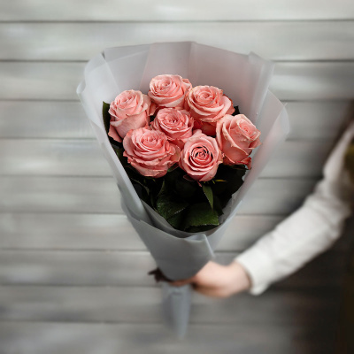 7 розовых роз в упаковке Эквадор 60 см| 3 400 Р | без скидки |