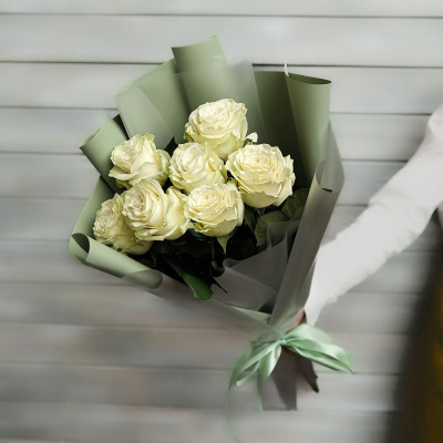 7 белых роз в упаковке Эквадор 60 см| 3 700 Р | без скидки |