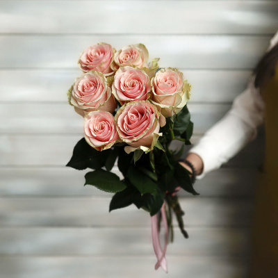 7 нежно-розовых роз с лентой Эквадор 60 см| 3 700 Р | без скидки |