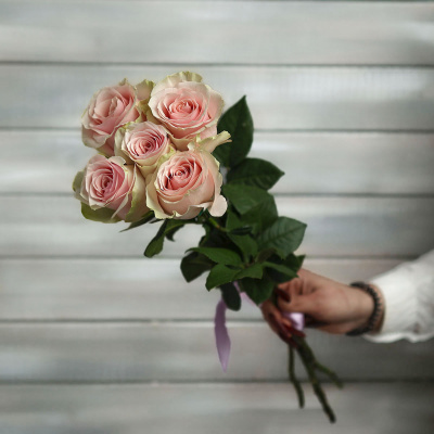 5 нежно-розовых роз с лентой Эквадор 60 см| 2 700 Р | без скидки |