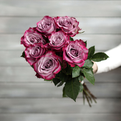 7 фиолетовых роз с лентой Эквадор 60 см| 3 200 Р | без скидки |