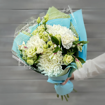Хризантема одноголовая,Роза 40 см,Гвоздика,Альстромерия,Лизиантус краш,Листья фисташки,Упаковка в ассортименте,Лента,Плёнка прозрачная