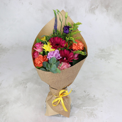 Роза 40 см розовая, Гербера мини белая, Гвоздика оранжевая, Гвоздика оранжевая, Хризантема кустовая желтая, Лизиантус, Гвоздика лунная фиолетовая, Вероника фиолетовая, Солидаго микс, Листья эвкалипт микс, Листья аспидистра, Листья салал, Лента, Бумага упаковочная Крафт, Плёнка прозрачная