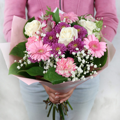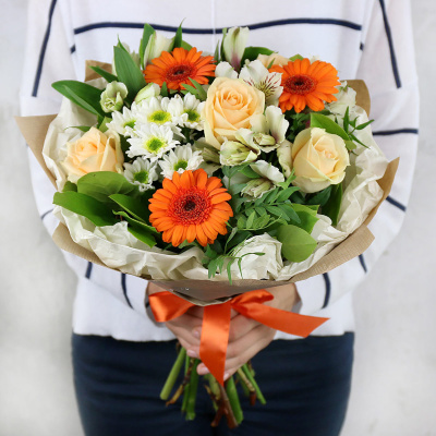 Букет из гербер, роз и альстромерии в крафте| 4 500 Р | без скидки |