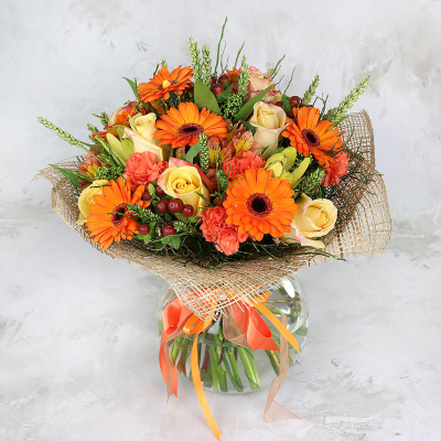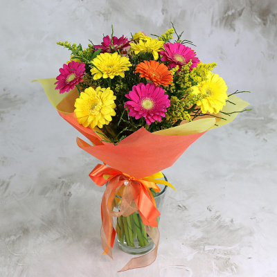 Букет из разноцветных гербер и солидаго в упаковке| 4 900 Р | без скидки |