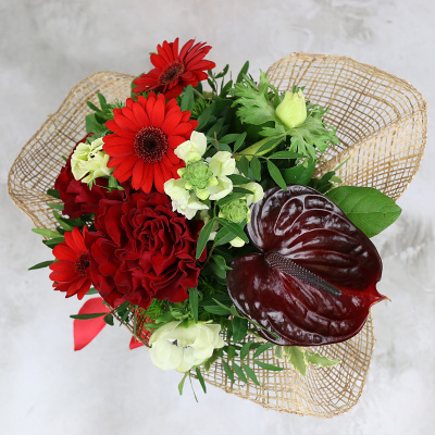 Букет из антуриума, гербер и анемонов в упаковке| 7 200 Р | без скидки |