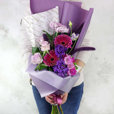 Гвоздика лунная фиолетовая, Гвоздика лунная фиолетовая, Гвоздика лунная фиолетовая, Гербера мини белая, Клематис фиолетовый, Листья фисташки, Роза 40 см розовая, Упаковка в ассортименте, Лента, Плёнка прозрачная