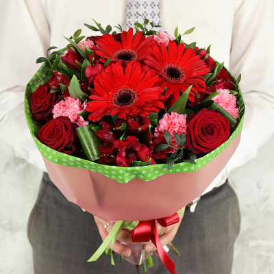 Букет из гербер, роз и альстромерий с листьями фисташки| 4 800 Р | без скидки |