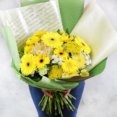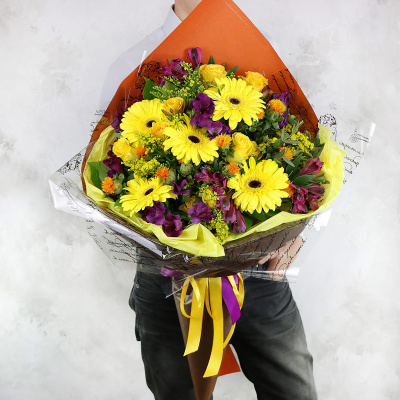 Гербера малиновая, Гербера мини белая, Альстромерия желтая, Ахилея, Хризантема кустовая желтая, Хризантема одноголовая розовая, Листья фисташки, Упаковка в ассортименте, Гвоздика оранжевая, Лента, Плёнка прозрачная
