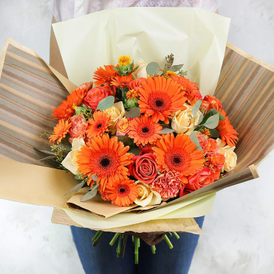 Хризантема кустовая желтая, Ромашка (Танасетум), Гербера малиновая, Роза кустовая 50 см оранжевая, Тюльпан малиновый, Роза 40 см розовая, Листья фисташки, Листья эвкалипт микс, Упаковка в ассортименте, Бумага упаковочная Тишью, Лента, Плёнка прозрачная