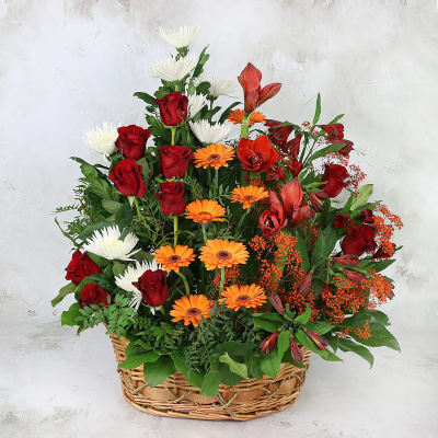 Корзина плетеная стандарт макси, Оазис кирпич, Амариллис красный, Хризантема одноголовая розовая, Роза Фридом 60 см, Гербера мини белая, Альстромерия желтая, Гипсофила, Листья салал, Листья фисташки, Листья аралия, Плёнка прозрачная