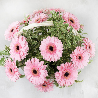 Композиция из минигербер и листьев питтоспорума в корзине| 5 900 Р | без скидки |