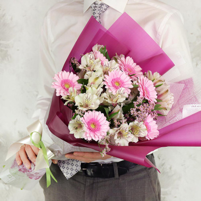 Гербера мини белая, Лимониум фиолетовый, Альстромерия желтая, Упаковка в ассортименте, Услуги флориста, Лента, Плёнка прозрачная