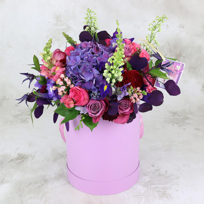 Композиция из ирисов, роз и гортензии в шляпной коробке| 21 400 Р | без скидки |