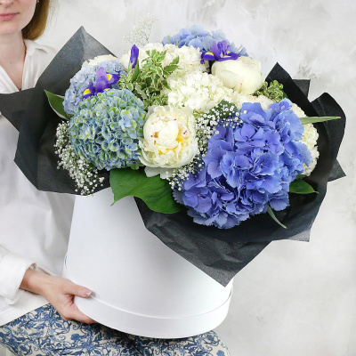 Композиция из гортензий, пионов, гипсофил и ирисов в шляпной коробке| 19 300 Р | без скидки |
